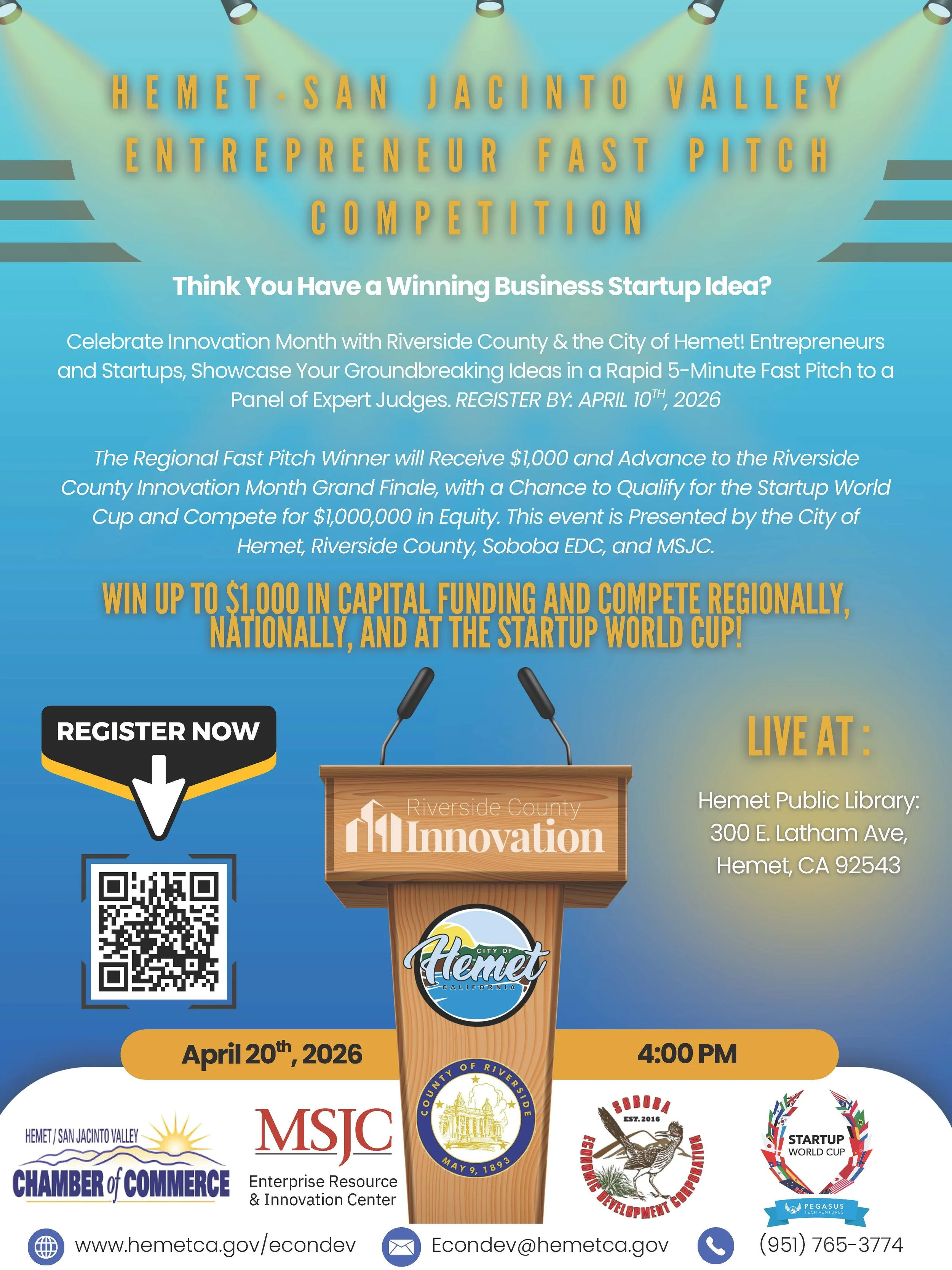 Entrepreneurs are invited to participate in a regional fast pitch competition, where they’ll present their ideas to investors, business leaders, and elected officials. The Pitch Finale winner will go on to represent Riverside County at the Startup World Cup Grand Finale, competing alongside top startups from around the world!